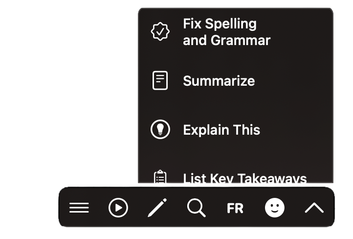 Fix grammar, translate to any language, rewrite tone, summarize — result replaces your selection instantly.